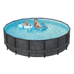 Las dimensiones de esta piscina redonda son de 76 cm de longitud, con un diámetro de 366 cm. Esto permite una capacidad de 6.503 litros.