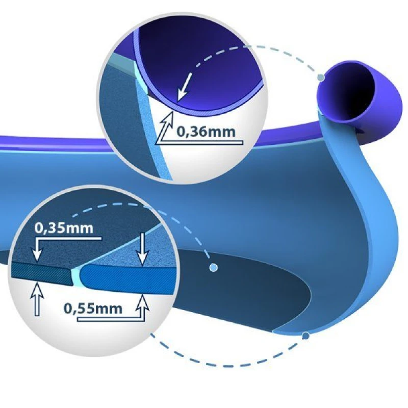 La piscina Easy Set de Intex tiene un espesor resistente, diferente en la base y las paredes de la piscina, para adaptarse a las necesidades y al uso del producto. El aro superior tiene un grosor de 0,36 mm, las paredes tienen un grosor de 0,55 mm y la base de 0,35 mm. De esta manera, la resistencia de su piscina estará adecuada al uso y tensión de cada parte de la piscina.